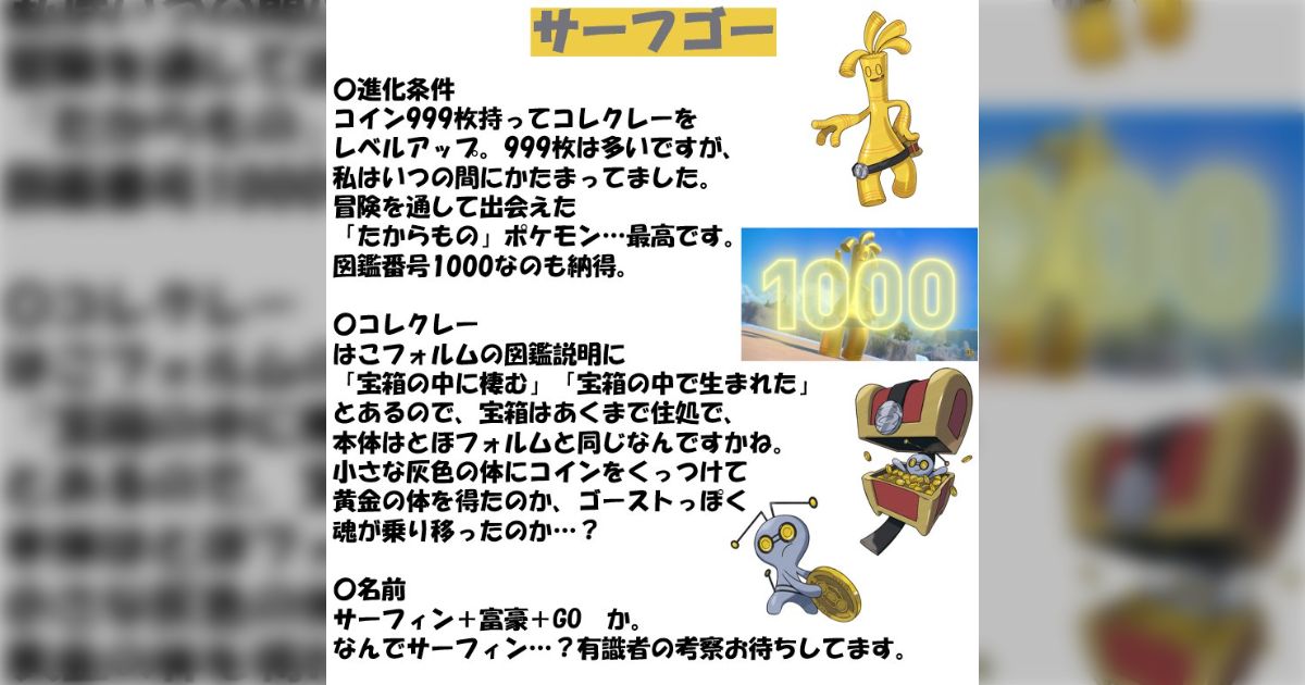 ポケモン週末レポート #037 サーフゴー23/01/20 No.1000 サーフゴー全国図鑑No.1000突破が公式で発表されたのを記念して、ランダム選出ではなくスタッフが選びました。 過去のお題に参加する(#037 サーフゴー)
